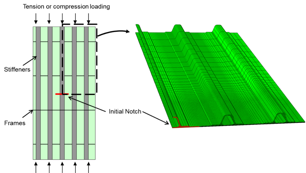 • Using progressive damage finite element (FE) analyses to capture all critical failure modes including skin damage growth, stiffener failure, and/or stiffener delamination.